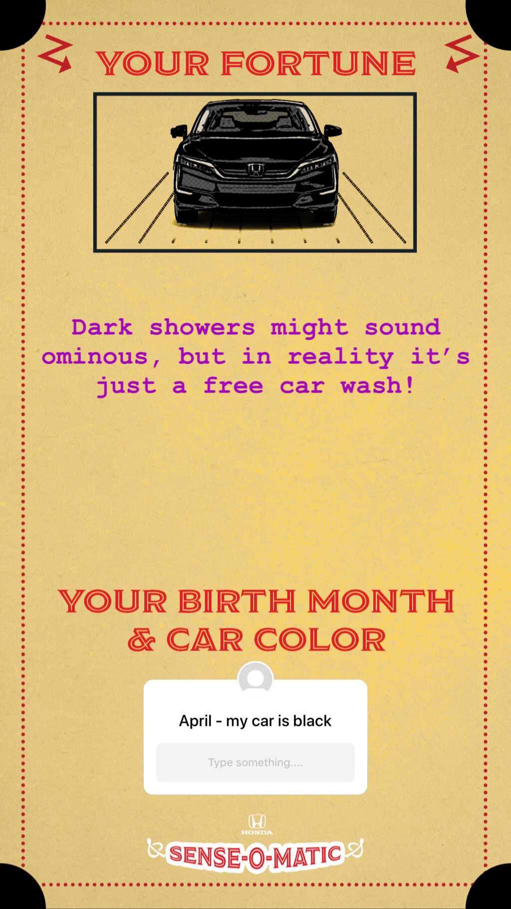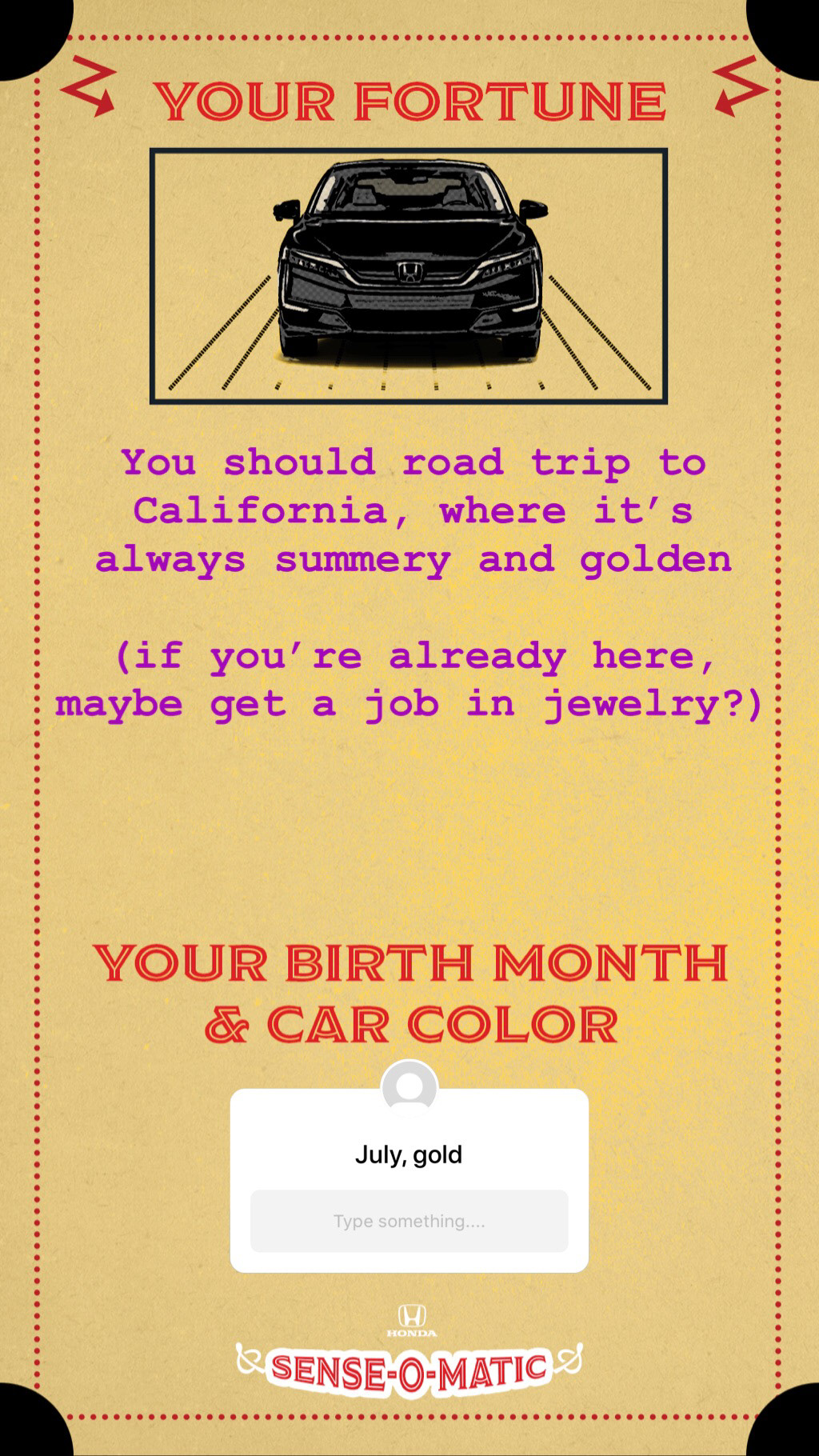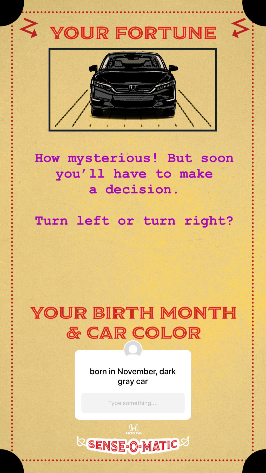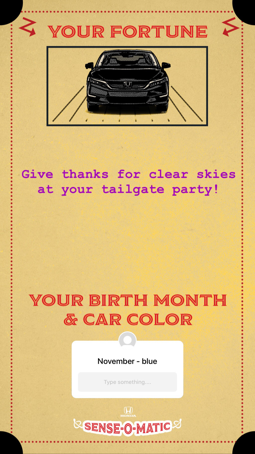 were born and the color of their car, and the Honda Sense-O-Matic will tell them their fortune.