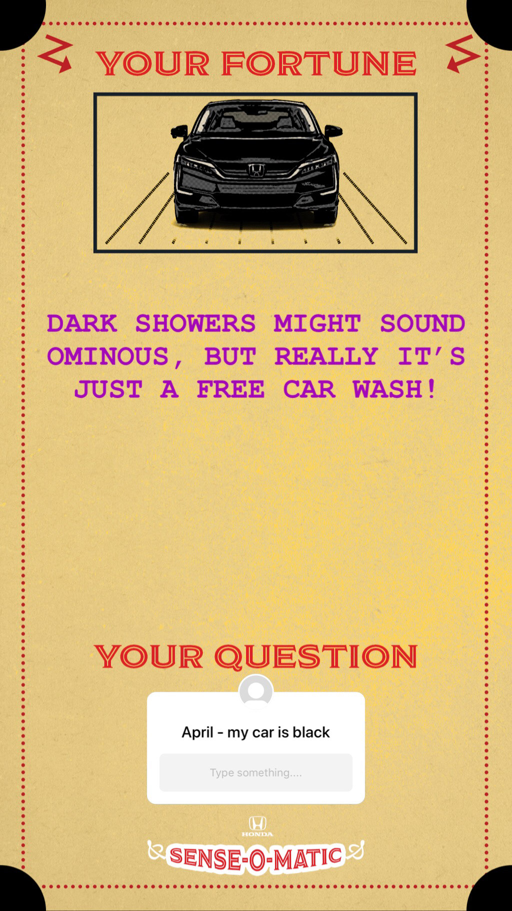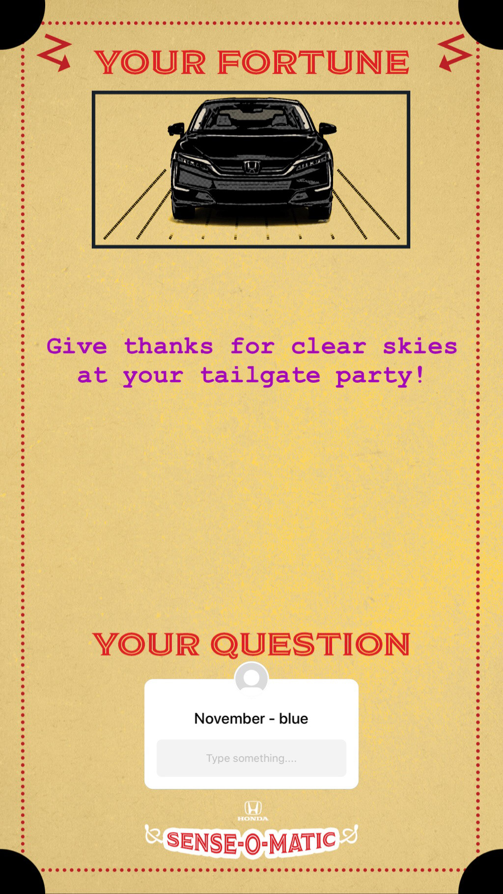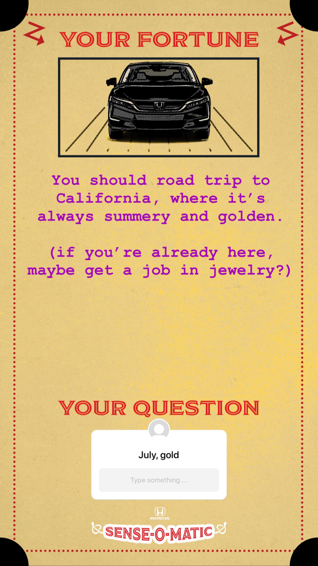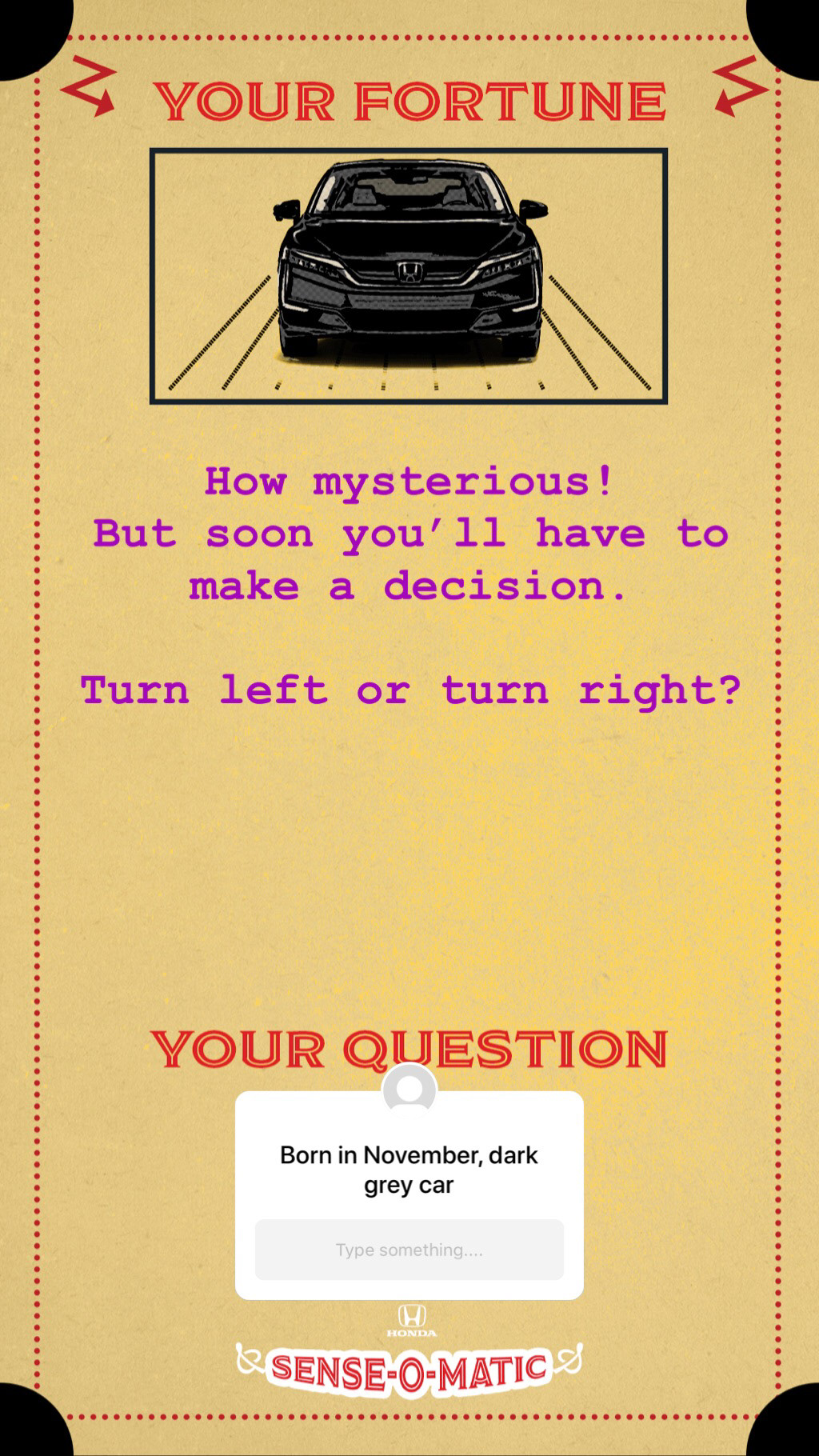were born and the color of their car, and the Honda Sense-O-Matic will tell them their fortune.